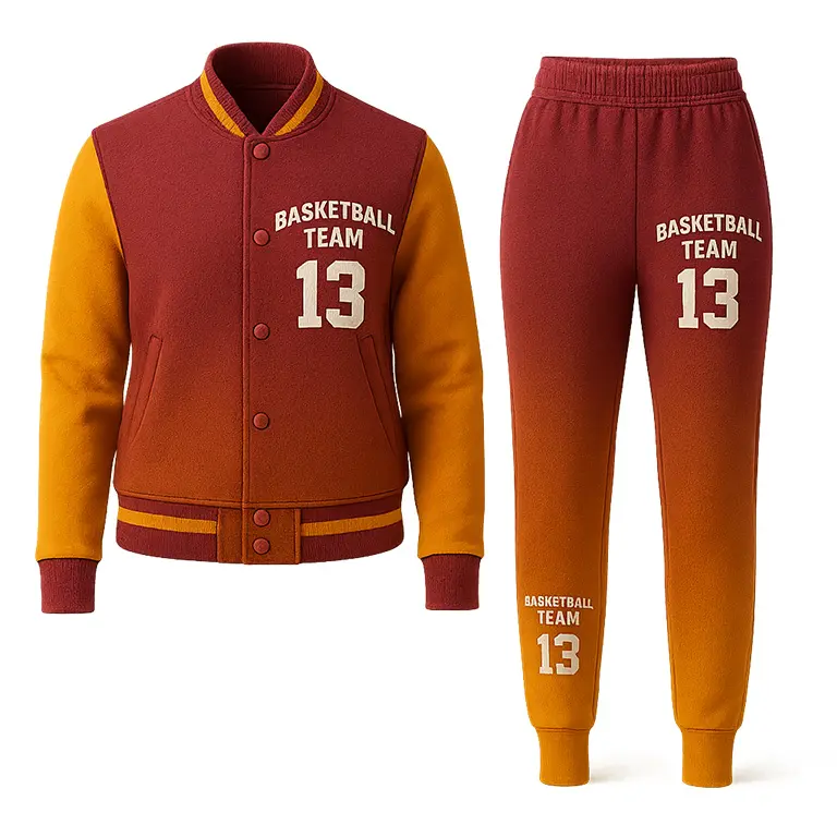 Баскетбольный костюм женский состоит из кофты-бомбера и спортивных брюк, выполненных в едином командном стиле. Крой адаптирован под женскую фигуру, обеспечивая удобную и аккуратную посадку. Модель создаётся по образцу на фото, но выполняется без кнопок и без молний на штанах, что делает костюм практичным, лёгким и комфортным для ежедневных тренировок.