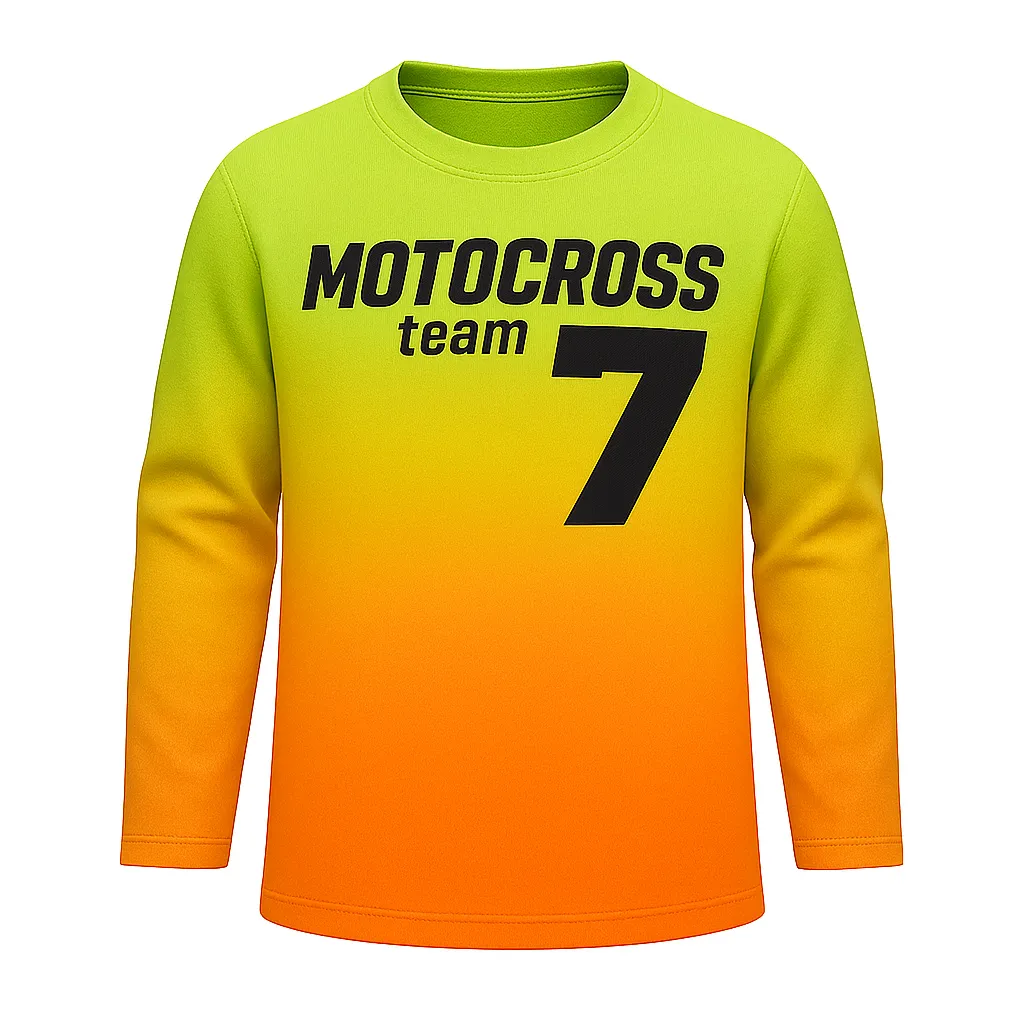 Детская джерси для мотокросса выполнена из лёгкого дышащего полиэстера, который быстро сохнет и комфортно сидит поверх защиты. Свободный спортивный крой не стесняет движений, учитывает ношение защиты груди, плеч и локтей. Материал хорошо отводит влагу даже во время активных заездов. Манжеты и горловина усилены и выдерживают частые стирки. Возможна печать логотипа мотошколы, номера пилота и фирменной графики.