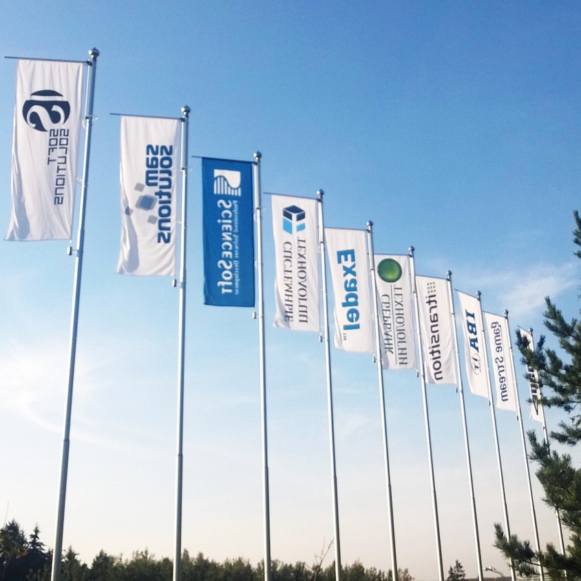 Алюминиевые флагштоки NordWerk, окрашенные в белый RAL 9016 или серый металлик RAL 9006 цвета (возможна окраска под заказ в любые цвета по палитре RAL), с вращающимся цоколем с опускаемым баннерным плечом (баннер-лифт) для флага шириной 1,5 м, петлями и утяжелителем, скрытым фиксатором шнура, декоративным навершием Euro Top или Луковица (золото / серебро), основанием с гильзой и анкерными болтами.