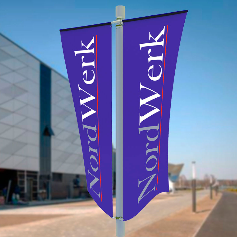 Система Стрит Твин Лайт предназначена для крепления рекламных баннеров, к вертикальной опоре (столбу). Нижние наружные углы флагов остаются незакрепленными.